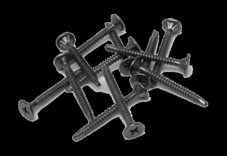 Black phosphate self-tapping screws with countersunk phillips heads, for fixing plasterboards to metal framing. The fasteners are for use on steel thickness between 0.7 mm to 2.0 mm. The screws are tested and they comply to ASTM C1002 – 07.
